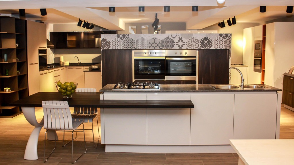 A contemporary Italian kitchen featuring a multifunctional island with integrated dining, combining design, practicality, and everyday comfort.